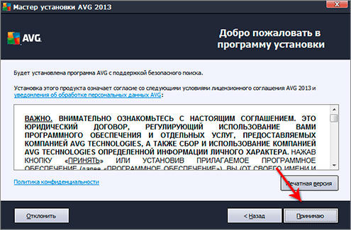 Принимаем условия лицензионного соглашения, нажав кнопку «Принимаю».