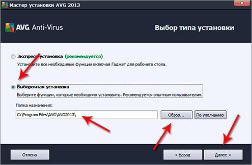 В следующем окне ставим переключатель на режим «Выборочная установка», так у нас будет больше выбора, чтобы настроить, что нужно установить, а что для нас лишнее. Здесь сразу же появляется возможность выбрать, в какую папку хотим установить антивирус, или можно оставить по умолчанию, я так и сделаю. Нажимаем «Далее».