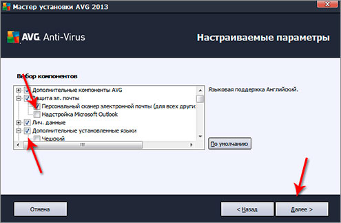 Теперь можно убрать некоторые галочки, тем самым не устанавливая, что не нужно. Например, я убираю надстройку для Microsoft Outlook, и дополнительные языки, оставив только русский. Помимо того, что мы не устанавливаем лишнее, так еще и места папка с программой будет занимать немного меньше. Нажимаем «Далее».