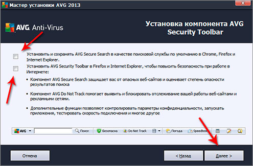 Отказываемся от установки дополнительного расширения для браузера, так как он не нужен, будет только затормаживать работу. Убираем галочки и жмем «Далее».
