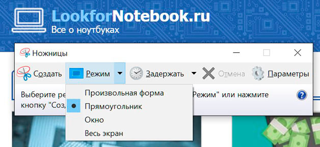 В Ножницах можно выбирать режим захвата изображения на экране: произвольная форма, прямоугольник, активное окно или весь экран.