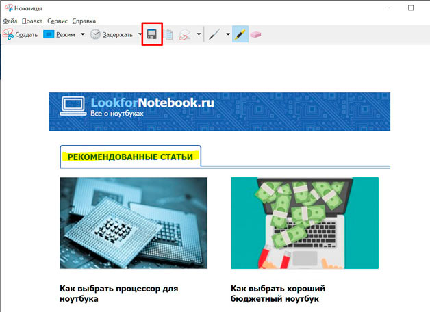 Сохранение рисунка делается в программе Ножницы с помощью кнопки с дискетой.