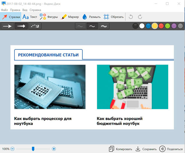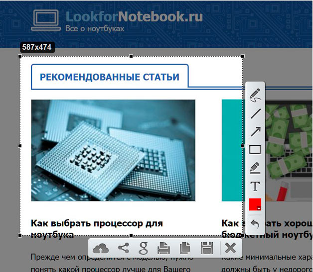 После снятия снимка экрана ноутбука программа позволяет отредактировать рисунок. Поддерживаются стрелки, прямоугольники, карандаш и вставка текста.