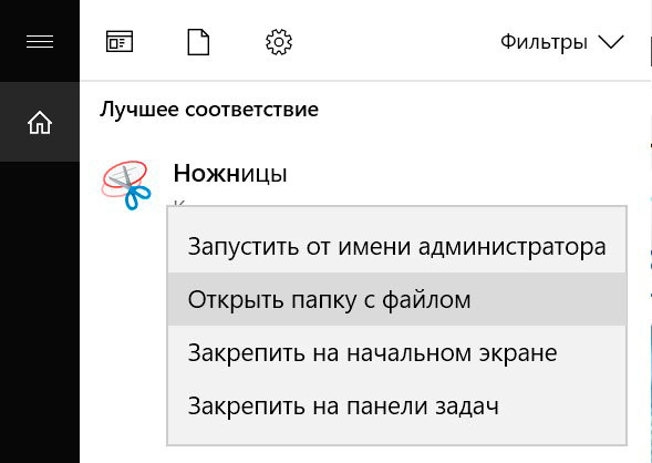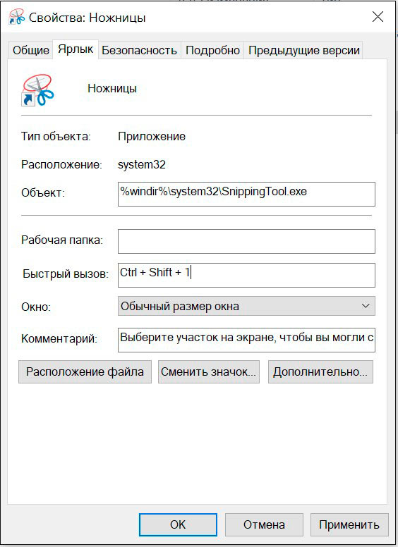 Для более удобного пользования Ножницами назначьте на их ярлыке горячую клавишу. Например, Ctrl-Shift-1. В списке приложений на иконке Ножниц нажмите правую клавишу мыши и выберите Открыть папку с файлом.