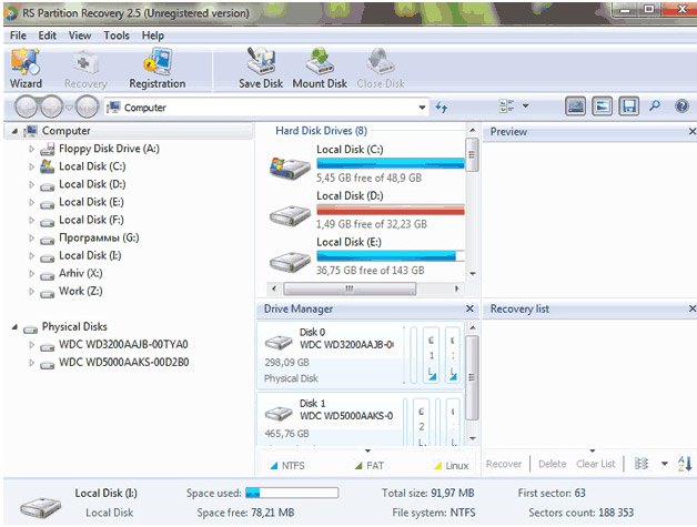 Логические разделы лучше лечить сторонними приложениями, одно из которых – RS Partition Recovery. Основное окно здесь разделено на части: