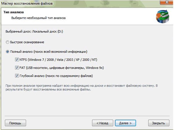 - Кликните «Далее», после чего приложение предложит указать тип анализа выбранного раздела. Отметьте быстрое сканирование или полный анализ.