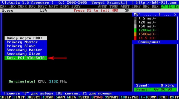 - В окошке выбора порта HDD кликните по последнему пункту Ext. PCI ATA/SATA.