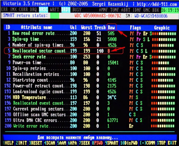 - Отметьте накопитель, нажмите Enter, затем F9. В открывшемся окне самоанализа можно будет увидеть состояние диска. В 5-й строчке указывается число блоков, которые были переназначены на имеющиеся еще резервные сектора. Количество последних ограничено – когда они заканчиваются, информация в бэд-секторах начинает теряться. Выделенная красным цветом цифра свидетельствует, что жесткий диск состояние имеет плохое – его нужно лечить.