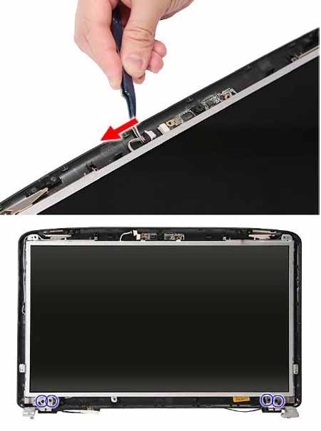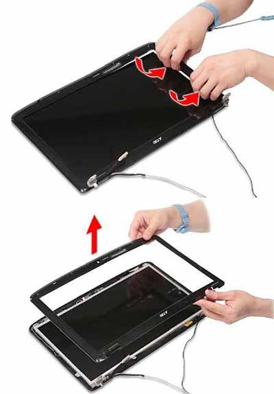При разборке ноутбука следует помнить, что болты в разных комплектующих могут различаться размером, поэтому чтобы в дальнейшем не запутаться, открученные болтики следует группировать и складывать порознь. Когда разобрали компьютер, откручиваем болты рамки лэптопа. Помимо болтов, рамка крепится большим количеством защелок. Чтобы их отсоединить возьмите тонкую лопатку, подденьте грань рамки и потяните ее слегка вверх, когда услышите легкий щелчок – пройдитесь по всем защелкам вдоль периметра экрана. Отсоединяя лопаткой защелки, будьте особенно осторожны возле вебкамеры – здесь большое скопление проводов, которые легко порвать неосторожным движением лопатки.
