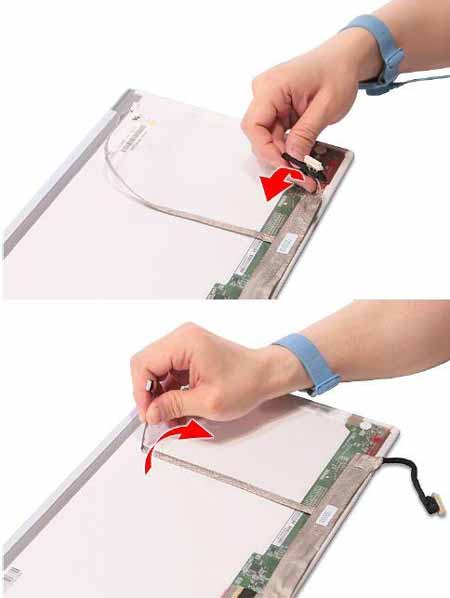 Под матрицей располагаются шлейф вебкамеры и Wi-Fi антенны, отсоединяем его потянув за шлейф, которым он крепится к матрице. Готово – матрица полностью отсоединена от экрана.