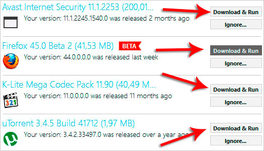 Для обновления любой программы напротив неё имеется кнопка Download and Run .