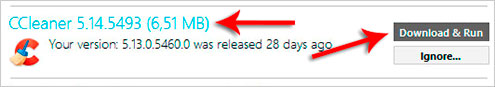 Например, у меня имеется обновления для программы CСleaner. Это замечательная программа для чистки системы от мусора и ненужных файлов. Чтобы её обновить я нажимаю Download and Run и жду несколько секунд пока скачивается свежая версия.