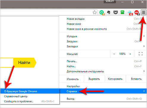 Чтобы обновить браузер Гугл Хром нажмите по кнопке инструментов и в открывшемся меню выберите пункты Справка – О браузере Google Chrome.