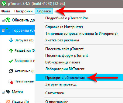 Чтобы обновить uTorrent жмите меню Справка – Проверить обновления.